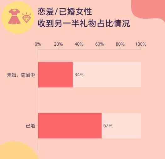 高达87%的受访者在去年妇女节收到了礼物,其中63%的受访者收到了来自另一半的礼物。其中,已婚女性收到礼物的比例达62%,恋爱中的女性收到恋人礼物的比例仅为34%。可见,已婚女性的另一半在3·8节更具仪式感。
