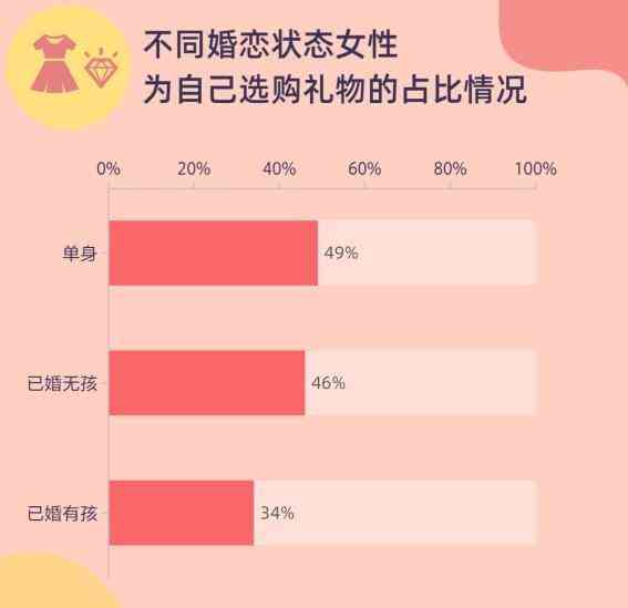 超40%的受访者同时收到了来自亲朋好友的礼物,也有同等比例的人为自己选购了节日礼物。单身、已婚无孩、已婚有孩的受访者为自己购买礼物的比率分别占所属人群的49%、46%、34%。由此可见,单身和暂未生育的女性在节日中更加宠爱自己,乐于为自己创造满足感。
