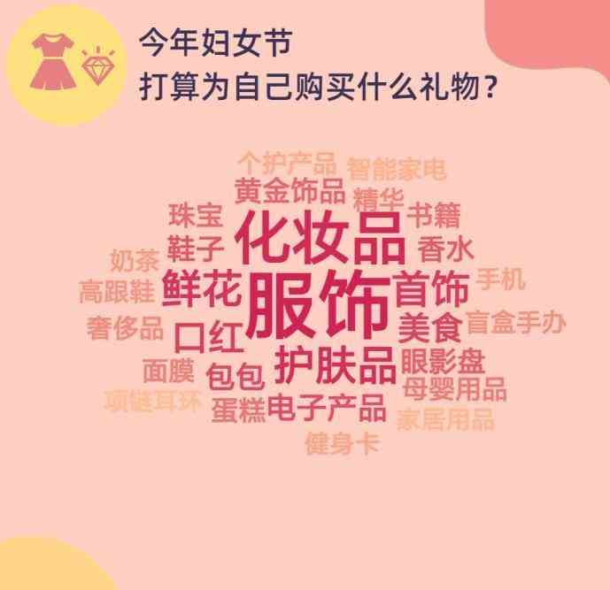 当被问到“今年妇女节,您打算为自己购买什么礼物”时,23%的受访者打算为自己购置服饰,20%受访者表示会为自己购买护肤品,17%女性计划购买化妆品。同时,鲜花、首饰也多次被提到。女性越来越重视自身的消费满足感,“对自己好一点”正在成为她们重要的消费习惯。