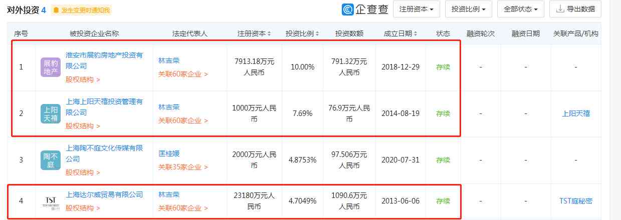 而这家公司全部对外投资业务里,四家公司三家都与林瑞阳(林瑞阳本名林吉荣)有关。