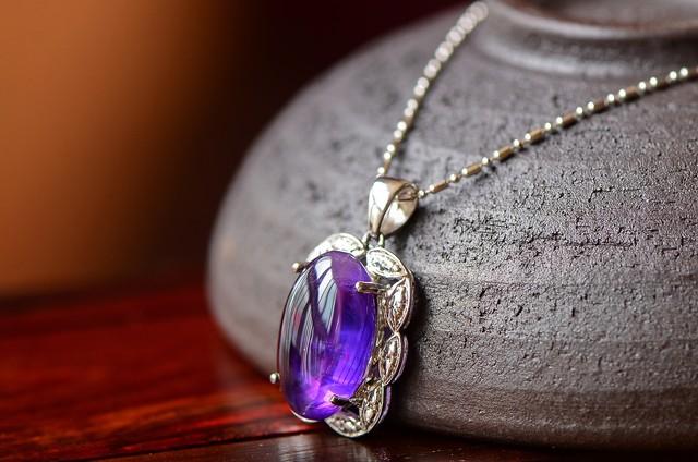 紫水晶,色如葡萄,晶莹剔透、十分高雅,是佛教的七宝之一。人们认为紫晶的晶洞能够给人带来好运和财气,佩戴紫水晶也有转运的含义。