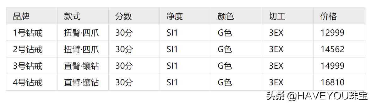 品牌款式分数净度颜色切工价格1号钻戒扭臂·四爪30分SI1G色3EX129992号钻戒扭臂·四爪30分SI1G色3EX145623号钻戒直臂·镶钻30分SI1G色3EX149994号钻戒直臂·镶钻30分SI1G色3EX16810