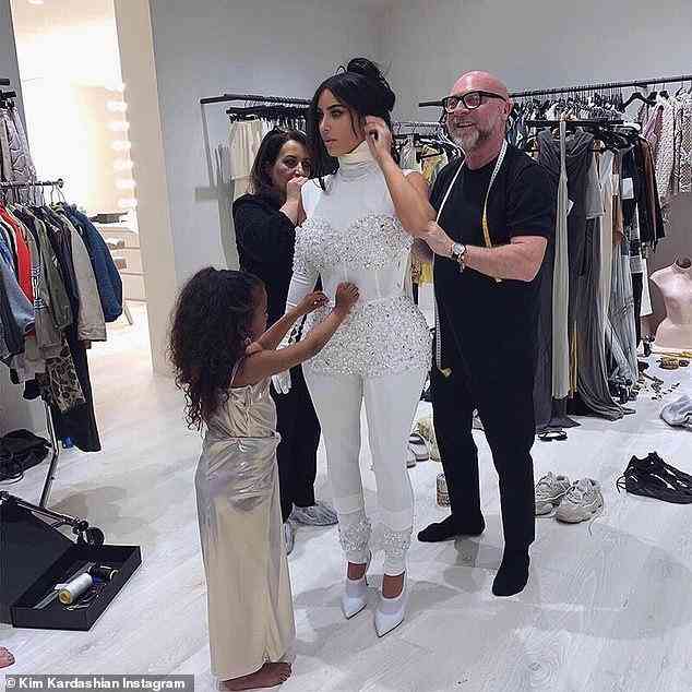 当天试衣服的照片里,有一个小助手亮了,小助手穿着一件银色的长裙,在帮卡戴珊整理衣服,看起来很认真的样子。这个小姑娘正是卡戴珊的女儿西北。