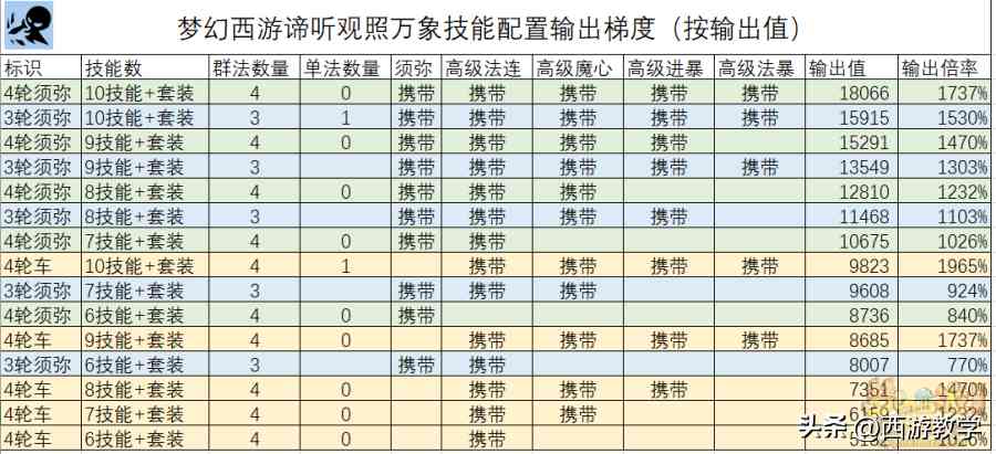 这是最近大神做的带着观照万象的谛听的各种技能的输出梯度,这个就可以供大家在选择谛听的时候该如何选择携带的技能,分为群法数量、须弥、四本法术书的携带情况,大家可以仅供参考,希望对大家有所帮助!