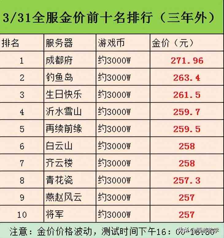 今天是四月份的天,然后昨天就统计好了全服金价排名前十名的服务器,希望对于大家有所帮助,排名名的服务器是成都府,比例是271.96,还是比较高的,下面的分别是钓鱼岛、生日快乐、沂水雪山、再续前缘、白云山、齐云楼、青花瓷、燕赵风云、将军,不知道你们的服务器有没有出现在里面呢?