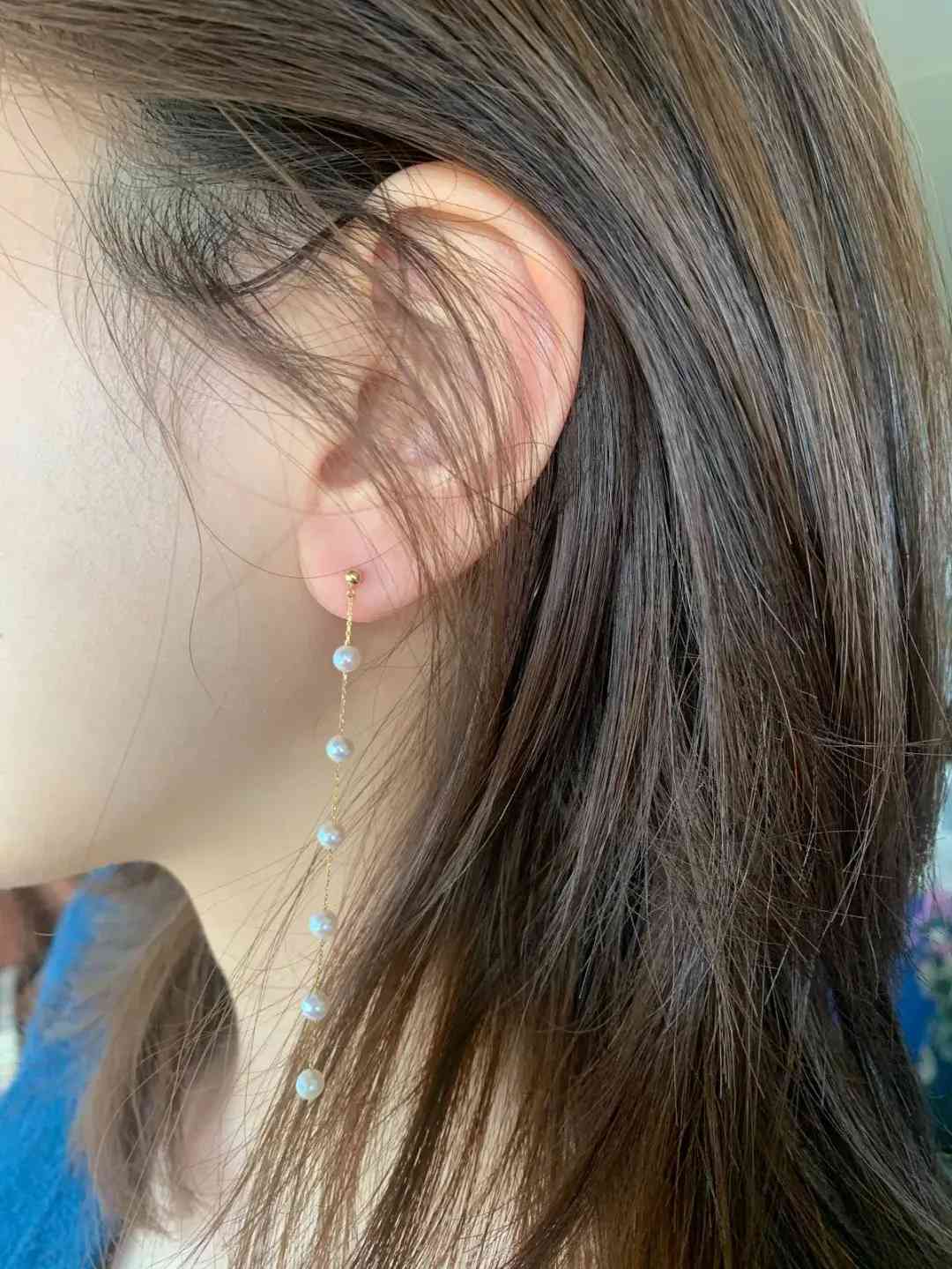 这款除了项链,还有同款的耳链,单条链子长度有8.5cm,链子也同样是18K金的,上面整齐缀着6颗4mm大小的淡水AKOYA珍珠,近正圆、亮光珠的规格,正常佩戴可以到脖子中间,非常修饰脸型,显气质,耳链平台上售价是499元。