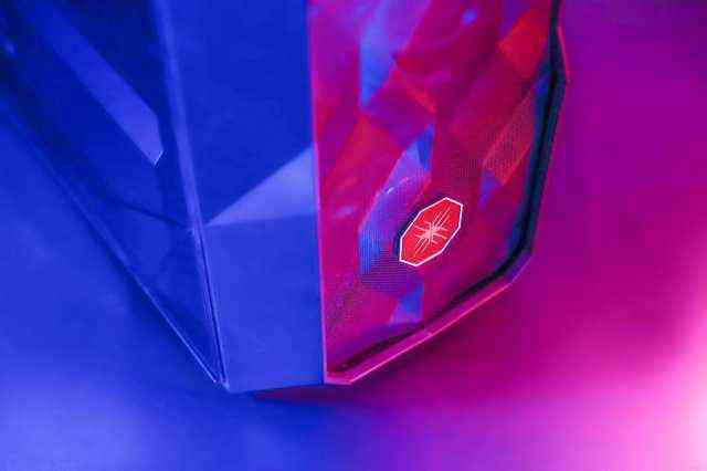 同时从侧面可以看到,不仅散热孔是菱形,仔细看面板的造型也是菱形镂空图案的设计,钻石切割处理很特别,不但视觉上冲击力强烈,透光性也非常好,结合风扇背光后,从不同角度能呈现出不同的视觉效果,电竞气息十足。