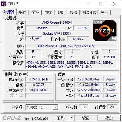 先说说处理器吧,AMDRyzen93900X处理器,拥有12核心24个线程,基础频率3.8GHz、最大Boost频率4.6GHz、TDP热功耗105W,对比一下同价位的Intel酷睿i9-9900K,AMD锐龙3900X多了4个核心8个线程,规格全面领先,这个性价比谁能不说一句AMD真香?
