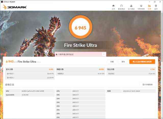 接下来看看RTX 2080SUPER显卡的测试,我们通过3DMARK?模拟多重游戏场景,分别在FireStrikeExtreme、FireStrikeUltra、FireStrike的测试中取得了13344、6945、23822的好成绩,基本反映了RTX2080SUPER的正常水平,3A大作基本可以碾压。