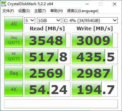 在针对硬盘的CrystalDiskMark测试中,我们可以发现读写速度达到了3548MB/s,3009MB/s。并且4K读写速度也有54.24MB/s,194.7MB/s,表现相当出色。