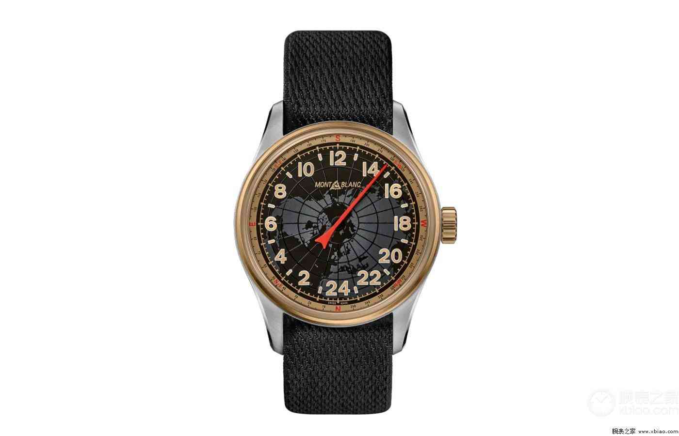 其中这枚万宝龙1858系列24小时自动上链腕表也是众多表款中最独特的一款时计,腕表设计独特之处就在于盘面设计,在饰有北半球地图和24条夜光子午线的黑色盘面上采用了24小时刻度显示,中置一根醒目的红色指针,指针及时标均涂覆夜光涂层,保证其具备极佳的读时清晰度。而中央这根红色尖头指针不仅具有指示时间功能,它还可以当做罗盘使用,搭配表盘外缘罗盘刻度以指示方位,其运作原理是因为地球每24小时绕太阳公转一周,太阳东升西落,如果你处于北半球,将腕表时间调至正确,将它平行于地面,再将腕表旋转直至红色时针末端指向太阳方向,表盘上的所有基本方位标识都将正确指示,如果处于南半球标识反之就是。