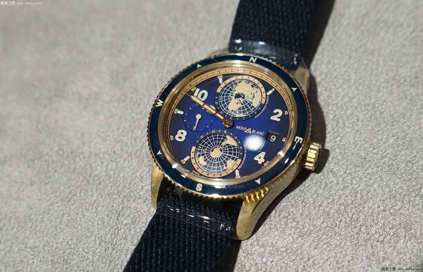 腕表整体和谐融合青铜、蓝色和镀玫瑰金元素,呈现出复古风格的美学设计,让人不禁联想到登山探险工具。表底盖印有勃朗峰山脉图案、完整的梅斯纳尔七峰名录、一个指南针和两把相互交叉的冰镐。这款腕表搭载表厂自制MB 29.25自动上链机芯,搭载世界时复杂功能,两个代表南北半球的旋转立体半球,每24小时自转一圈,二者周围均环绕24个时区的小时刻度,同时配以对比底色演示昼夜更迭。这款腕表的多时区显示更加直接、更具可读性,大陆图案也涂覆有夜光涂层,夜晚读时也尤为清晰。同时还给腕表配备一条法国历史悠久的编织缎带手工坊Julien Faure出品的蓝色表带,这条以传统工艺打造特色鲜明的奢华NATO编织表带,让腕表佩戴起来变得异常轻便,舒适贴合,且具有高度耐磨损和快干特性。