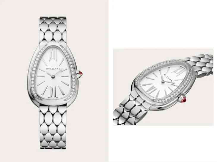 蛇形一直是宝格丽经典的品牌象征,Serpenti Seduttori系列表盘是水滴形蛇头,表盘薄,凸形蛋面切割宝石装饰,表带是借鉴Serpenti系列的蛇鳞造型,六边形链节。这些细节叠加在一起,整个表的造型仿佛是流动的,有种‘时光流动,我一直美好’的气质在里面。