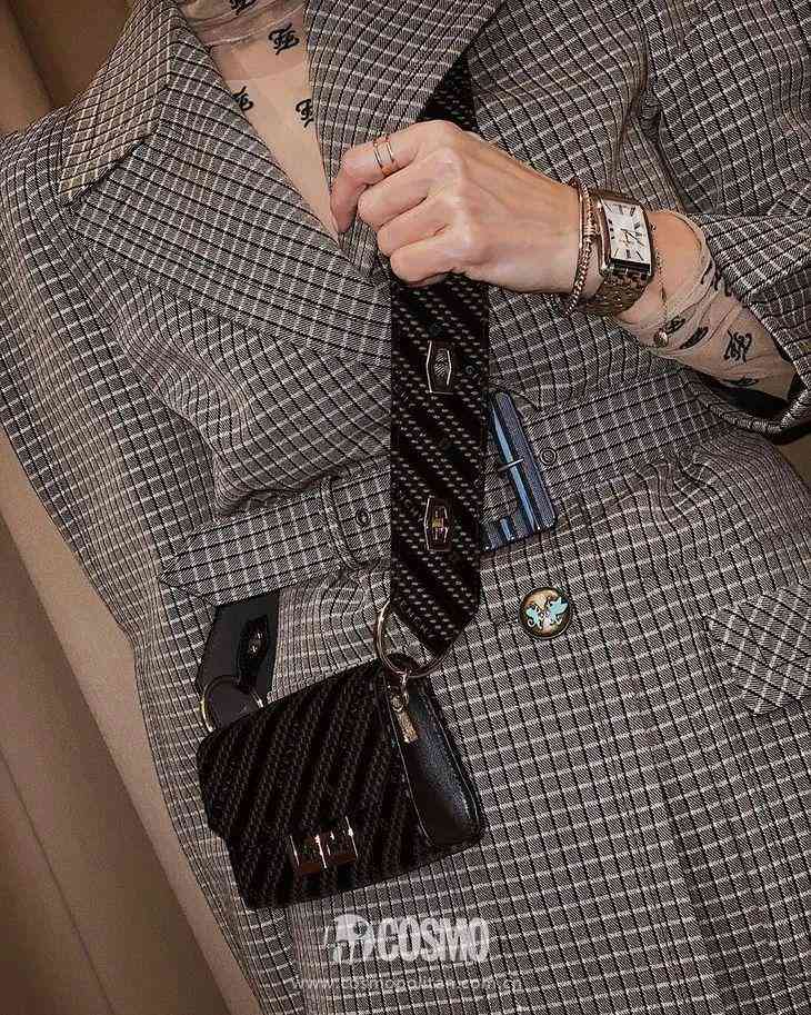 皮带腕表叠搭金属饰品乍看突兀,但其实细节结合得很巧妙,皮质既能丰富层次感还能减少全金属的夸张感。