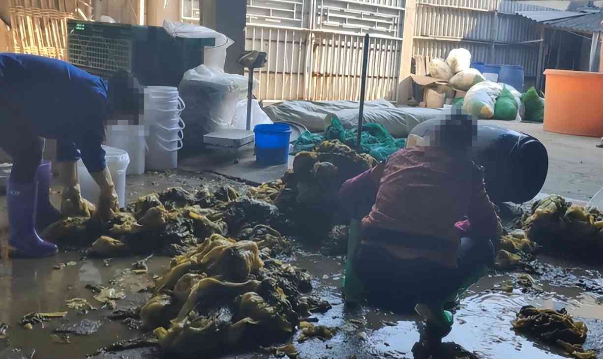 不光是黄金螺,就连工厂里的海参也是靠添加剂染色而成的。