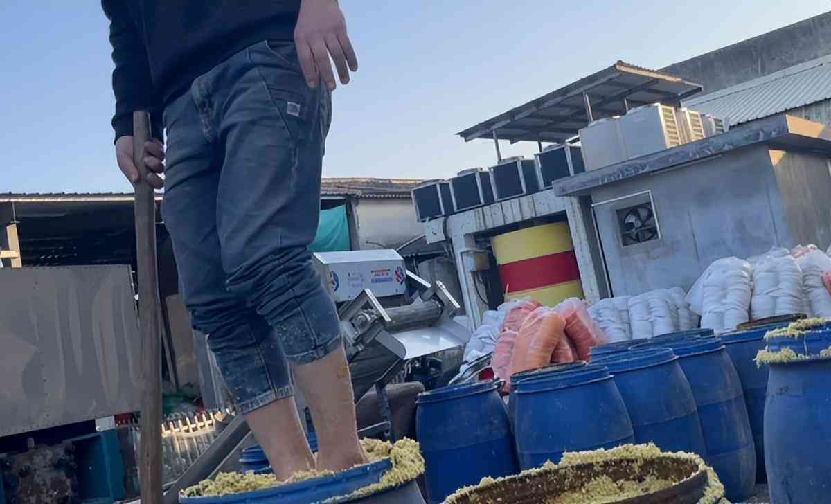 然后镜头一转,竟看到了一名大哥在化工桶里,潇洒地用脚踩着南姜。