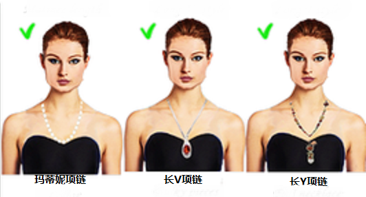 ✔ 长方形脸项链的选择:此种脸型的姑娘的项链在到锁骨以上是最好的长度,可佩戴带弧度的吊坠,精美的线条可以柔和长脸的不易靠近的感觉。分层式的项链也比较适合长方形的脸型。但是不太适合佩戴到胸部的长度比较粗的项链,V型会把脸部拉的更长失去协调。