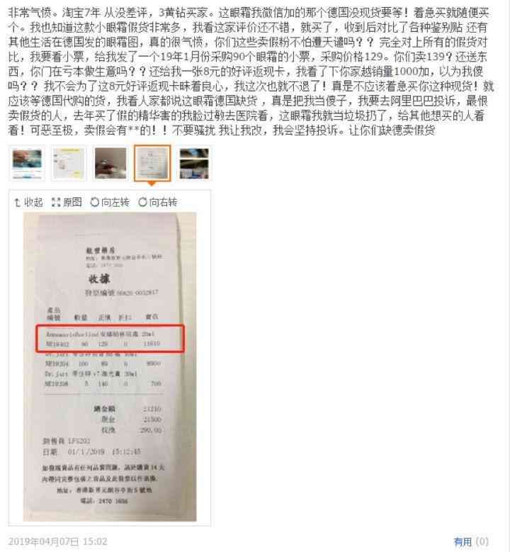 这个是我刚好要搜某个产品的时候看到的一个差评,不知道为什么假货商都很喜欢弄香港小票,可能是专门有这种工作坊做小票的,然后香港药房的小票比较容易打出来吧。