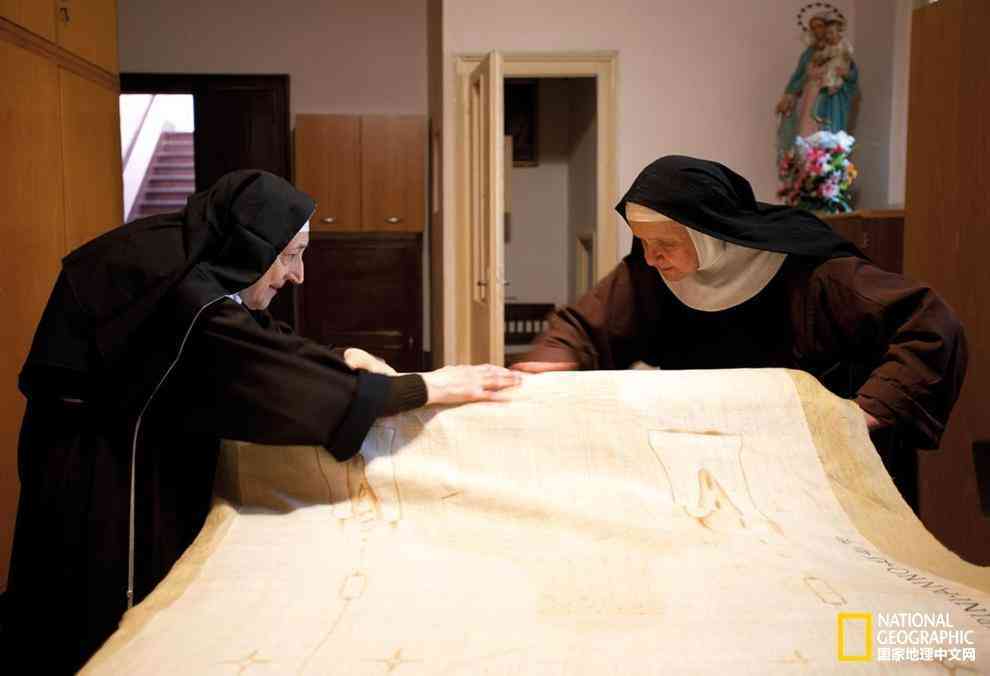 在意大利都灵的一家修道院里,修女们正在展开1644年完成的都灵裹尸布复制品。这件复制品经过了上色,而真品没有使用任何人工染料。