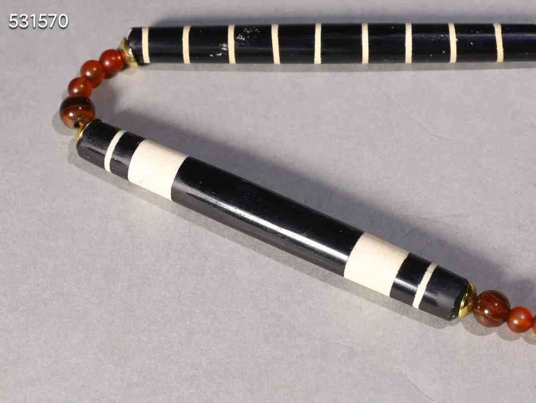 此天珠形体修长,两色相间,其规整清晰,天河分割并有序排列。包浆润泽,自然风化之痕迹明显,穿孔老道,手感极佳。带眼天珠为藏佛神圣之物,藏传天珠灵气巨大,令佩戴者财富日增,慈悲增长,权威显赫,有离苦得乐之意,值得收藏。