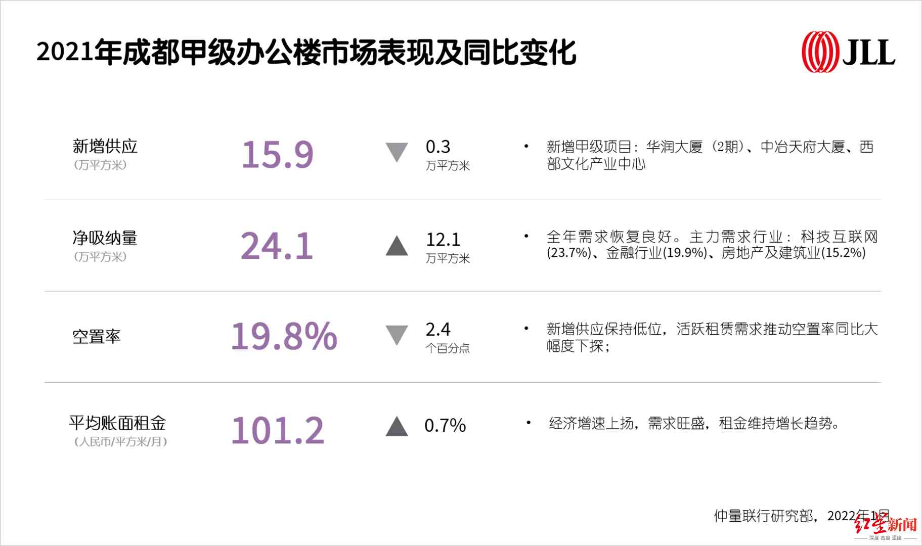 仲量联行成都商业地产部总监邓艳萍告诉红星新闻记者,2021年,成都生产生活基本恢复至疫情前水平,“因此,企业的办公需求呈V型反弹,逐步释放”。