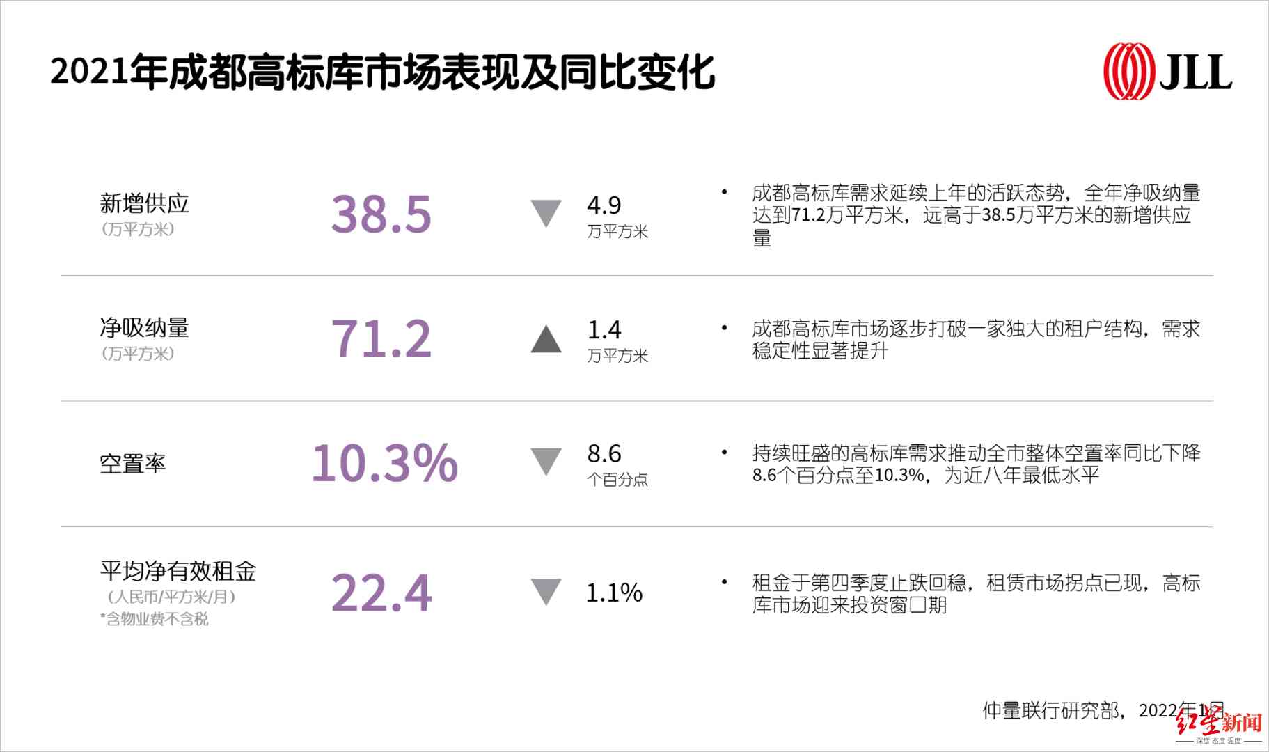 邓艳萍提到了一个细节:多家外省头部企业产业转移,聚集成都。她表示,本土企业成长迅速,截至2021年末,成都境内外上市公司达到128家,数量位居中西部。在年内新增供应较少的情况下,成都甲级办公楼市场出现局部区域供不应求,全市空置率于年末再次回落至20%以下,报19.8%。全年平均租金更是实现自2018年后的再次增长,同比增幅达0.7%。