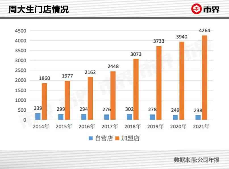 截至2021年底,周大福近95%的门店都是加盟店。2014年至2021年,周大生直营门店数量从339家减少至238家,加盟门店则从1860家增长至4264家,平均每年净开加盟店343家。