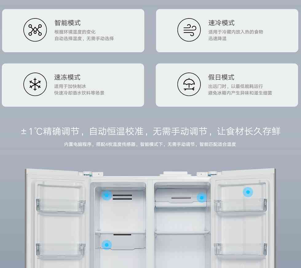 在智控方面,还有多个模式,米家互联网对开门冰箱能够实现精准控温,温度控制的偏差可以控制在±1℃。而以下四种不同的冷藏模式也让各种场景下冰箱的表现都足够出色。它有着智能模式,能够根据环境温度的变化,自动选择合适的设定温度,无需用户手动选择。特别是假期模式,出远门时,以最低能耗运行,避免冰箱内产生异味和滋生细菌。