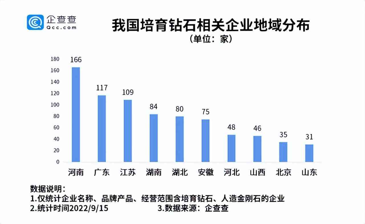 据企查查统计,按照企业名称、品牌产品、经营范围包含培育钻石、人造金刚石筛选后按照地域排名,河南相关企业有166家,比第二名广东多了49家。