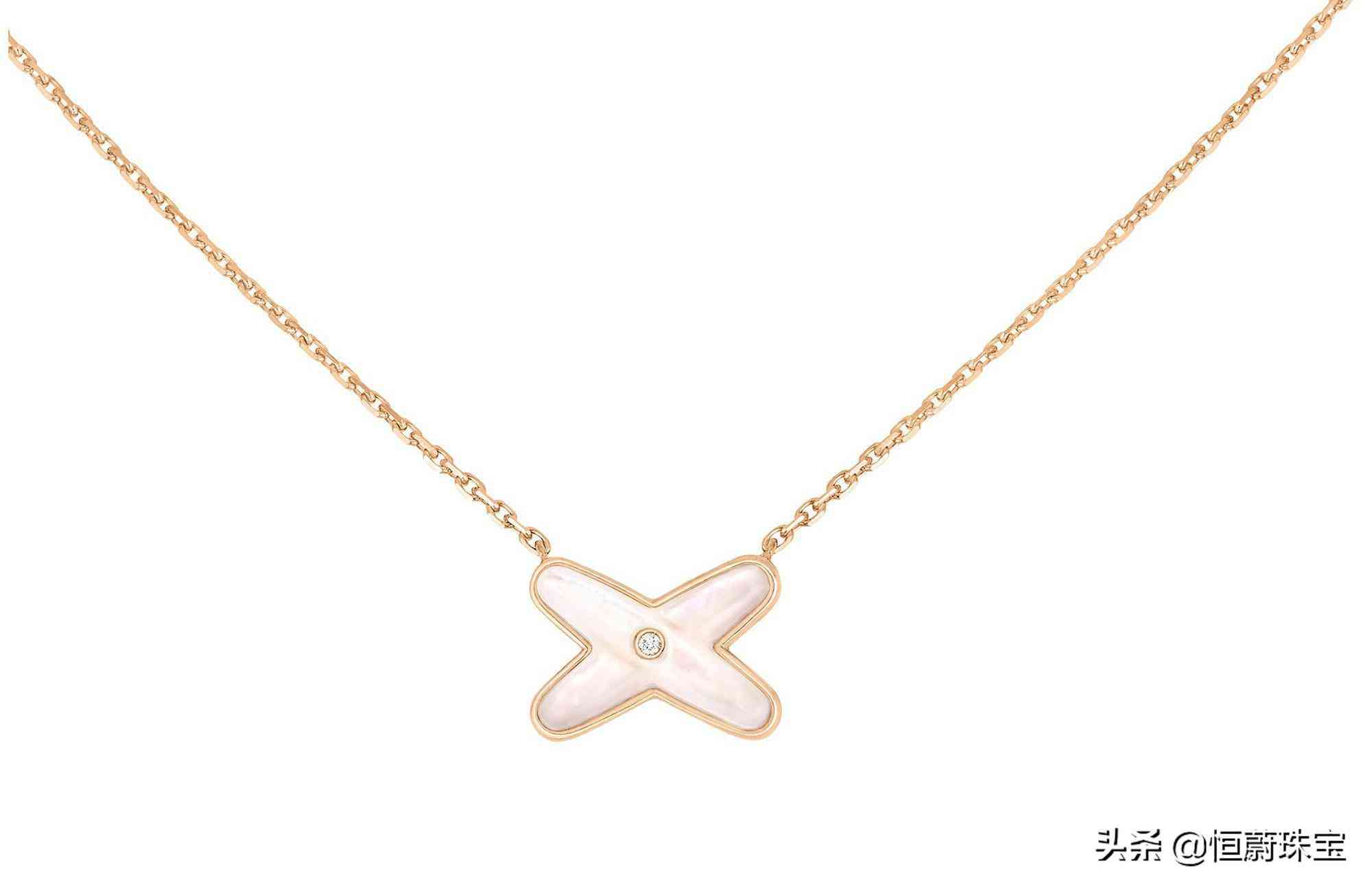尚美巴黎也是法国的知名品牌,推荐的入门款式是缘系·一生系列的交叉项链,采用18K金材质,搭配无色天然钻石,以及珍珠母贝等多个颜色的石头,价格12900元。