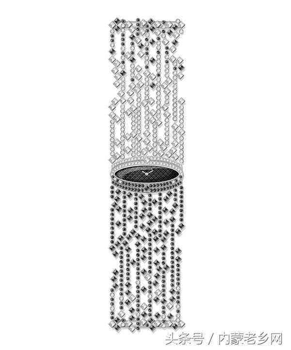 黑色尖晶石与晶莹钻石如瀑布般倾泻而下,华丽璀璨,绝美耀眼。 悬置时,绚烂光线在肌肤上灵动游走。 别出心裁的单色对比,迷你表盘镶嵌双排珍贵宝石,黑色与白色完美相融,呈献美不胜收的视觉效果。