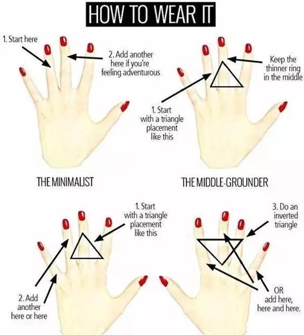 虽然叠戴很时尚,但如果每根手指都戴上戒指,太紧促、繁复,反而显得累赘,适度留白能放大艺术性和美感,留给人想象的空间,每只手留出一两根、甚至三根手指的空白,更有风头哦,同时要避免小拇指、无名指同时戴,以免招来过路财神,有财却留不住,还可能漏财。