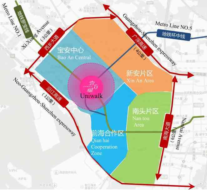 项目地处前海、宝安双中心,地铁1号线、5号线、11号线直达,直通25条公交线路枢纽场站,交通优势显著,潜在消费人群除200万商圈人口外,还包括400万消费力极强的宝安区常住人口。