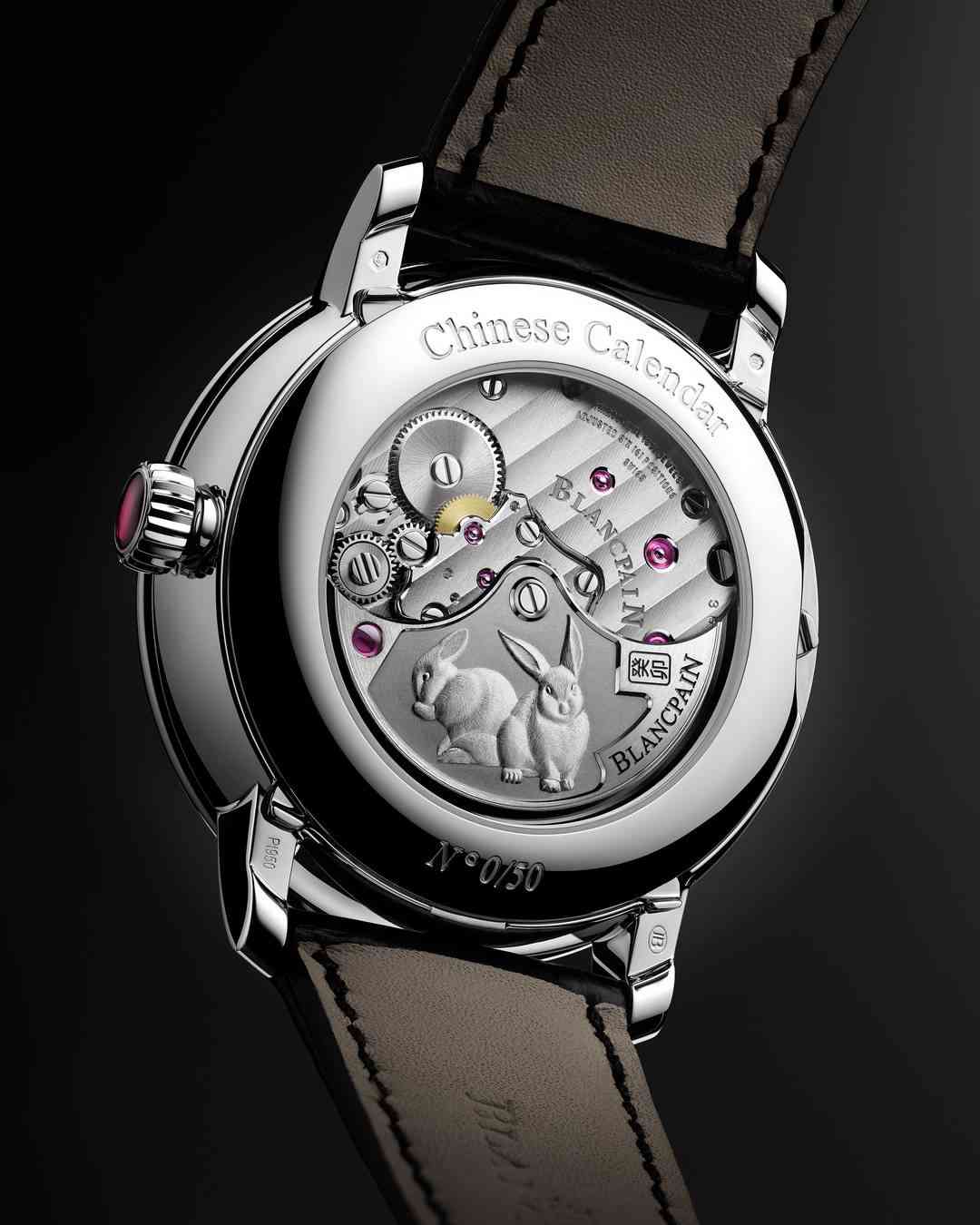 宝珀今年推出的全新经典V系列中华年历限量款腕表,由铂金打造而成,限量发行50枚,表盘上呈现了干支纪年、阴阳合历、十二时辰、生肖五行等中华年历独有显示功能,摆陀上还镌刻有一对栩栩如生的宝兔图案。