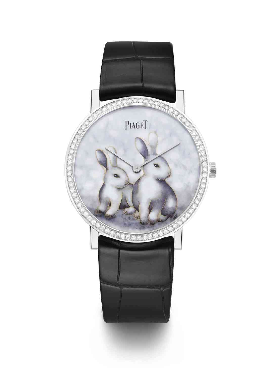 该腕表独立编号限量发行38枚,由珐琅艺术大师Anita Porchet(自2006年起便与PIAGET伯爵倾力合作)运用其高超的艺术造诣倾情打造。表盘上两只灵动白兔惟妙惟肖,在饰有78颗明亮式切割美钻(约0.71克拉)的38毫米18K白金表壳的映衬下,倍显璀璨亮丽。