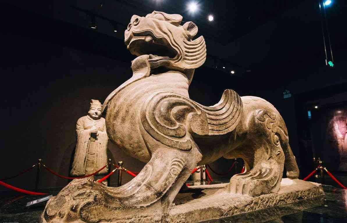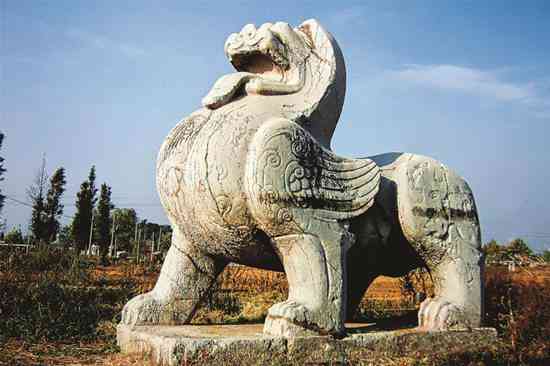 这种长犄角带翅膀的神兽“天禄”和“辟邪”,还真不是何大师杜撰出来的,从汉代开始就有了。汉代由于张骞通西域,我国和西域地区有了深入的文化交流,西方流行的带翼神兽“格里芬”、狮子等形象也跟着传入我国,结合我们自己的一些传说,产生了很多新的神兽,其中就有天禄和辟邪。一般认为天禄和辟邪都是带翅膀的有角兽,独角的叫天禄,双角的叫辟邪,它们还有个统称叫“桃拔”或“符拔”。如孟康对《汉书》所做的注释:“桃拔一名符拔,似鹿(实际上并不像鹿,更像狮子老虎),长尾,一角者或为天鹿,两角或为辟邪。”这里说的是“或为”,所以有时候也不是严格按照独角和双角来区分。其实我们几千年的历史中,在没有照片、网络等技术手段的情况下,这种名和物的对应很难做到完全一致,常常是非常混乱的。自然界真实存在的动植物,还不一定都能认得那么准呢,更何况是传说中的神兽呢。有点扯远了,总之神兽体系中确实存在天禄和辟邪,后来这两位常常被放在帝王的陵墓前,还是比较常见的。