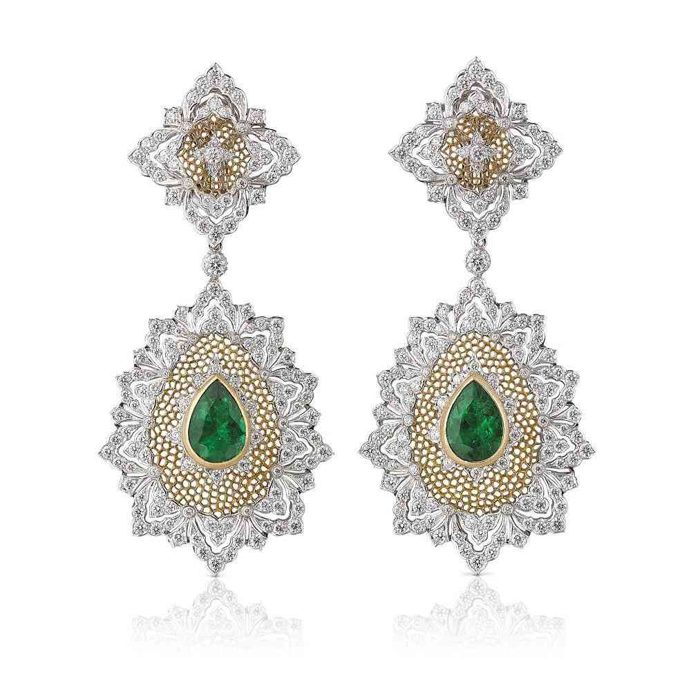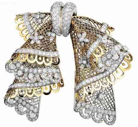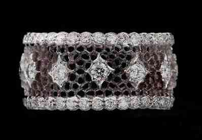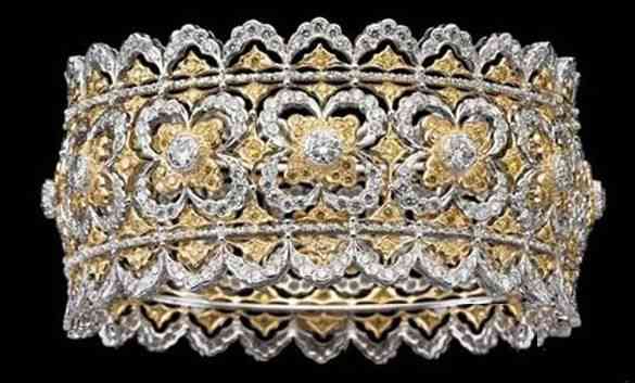 亦舒曾说:“白金夹黄金,小巧的宝石,异常精致的图案,纤细多姿得犹如神话中仙女佩戴的饰物,引人入胜。因有种迷茫的美丽,现实生活中罕见,镶作鬼斧神工。”师太这里夸的其实就是意大利珠宝品牌布契拉提(Buccellati)独有一种手工镂空技艺:珠罗纱(Tulle)工艺。它也被称为织纹雕金或蜂巢(Honeycomb)工艺,其灵感来自文艺复兴时期的蕾丝面料。