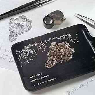 雕刻工匠用被称之为”冰凿”的工具,在珠宝表面细细雕琢,确保每个细孔哪怕在放大镜下都能完美无缺。并赋予其特殊的光影变化,雕琢好的珠宝高光与阴影的对比犹如一副伦勃朗的油画般生机勃勃富有写实的活力。