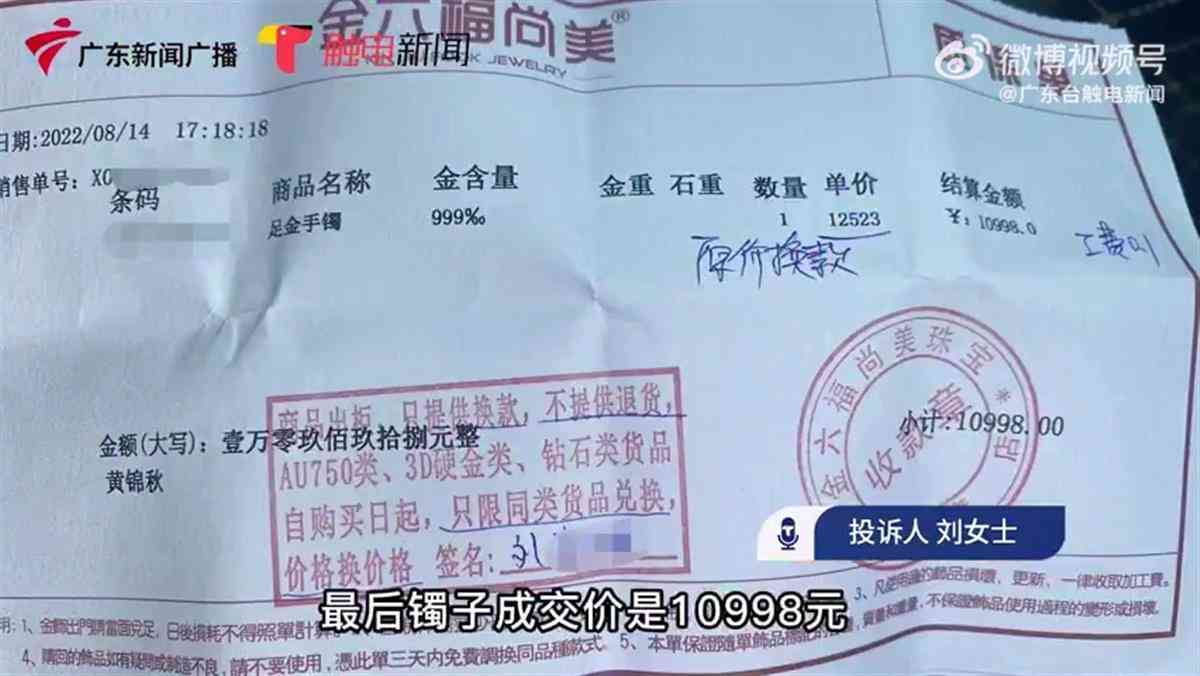 据报道,8月14日,刘女士在惠州石湾镇金六福尚美珠宝店看中一款一口价的黄金手镯,店员告知手镯有十几克,且采用能将“3克黄金压缩成1克”新型5G工艺。刘女士付款10998元将手镯买回家后,发现该手镯只有8.5克,每克单价约1300元,是市场价格3倍多。刘女士感觉受骗,请求退货遭拒绝。此后,经市场监管部门调解,珠宝店和刘女士达成和解,将一口价黄金手镯换为克数黄金产品。