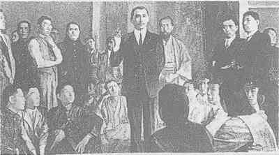 今日何年,共诸君几许头颅,来此一堂痛饮;万方多难,与四海同胞手足,竞雄廿纪新元。
