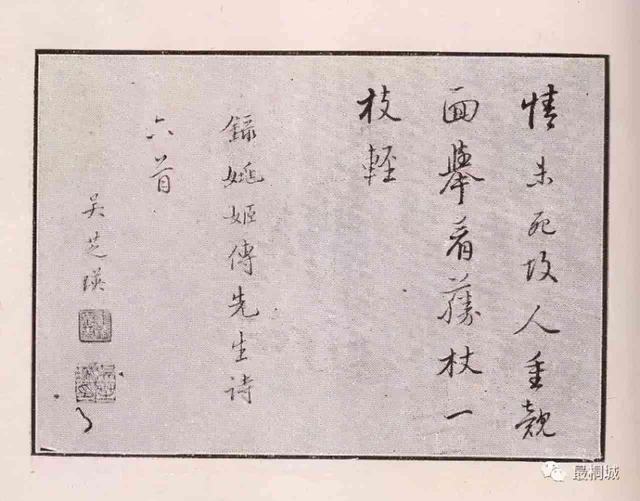 ◎秋声梧树撼楼风,秋声何太苦? 闲拈芳菊词,试把商音谱。◎春暮口号春从何处来?春向何处去? 杜宇尽催归,问之无一语。◎寄徐伯荪十日九不出,无端一雨秋。 苍生纷痛哭,吾道例穷愁!◎春草草色满平芜,春风次第苏。吹嘘须着意,莫使感荣枯。◎咏琴手抱绿绮来,七弦发清响。但恐所好殊,不遇知音赏!谢道韫咏絮辞何敏,清才扫俗氛。可怜谢道韫,不嫁鲍参军。◎对酒不惜千金买宝刀,貂裘换酒也堪豪。一腔热血勤珍重,洒去犹能化碧涛。◎赤壁怀古潼潼水势向江东,此地曾闻用火攻。怪道侬来凭吊日,岸花焦灼尚余红。