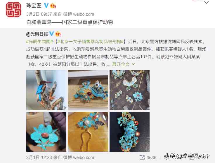 2021年开年,一个消息在珠宝圈激起千层浪——北京警方在一次行动中起获点翠工艺品107件,犯罪嫌疑人以非法出售、收购珍贵濒危野生动物制品罪被刑事拘留。