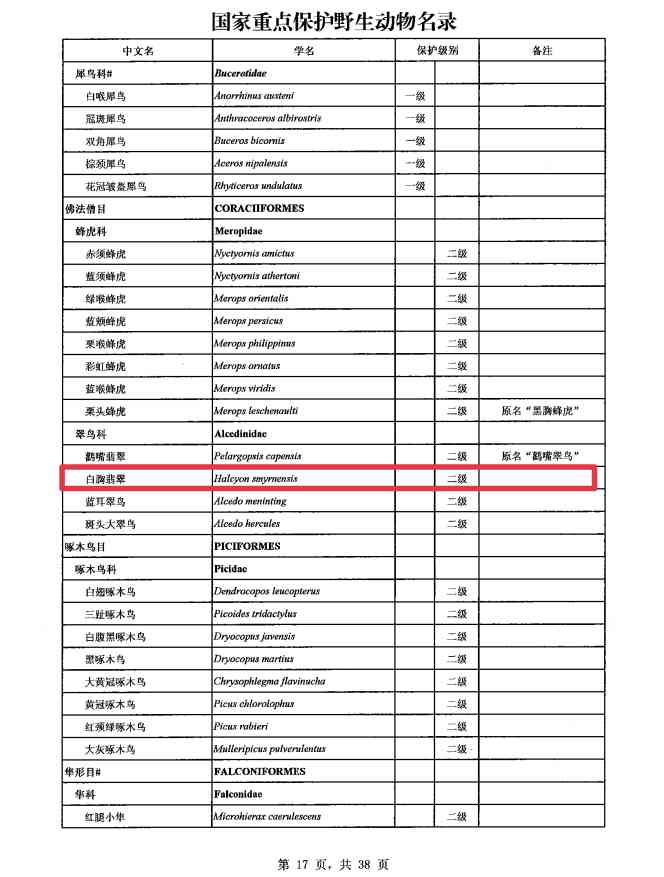 2021年2月,新版《国家重点保护野生动物目录》正式公布,白胸翡翠被纳入国家二级保护动物名录。保护级别提高,非法收购、出售白胸翡翠的行为将构成刑事犯罪。