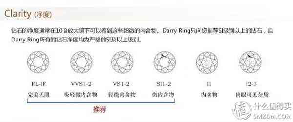 相较之下,净度的重要地位并没有那么高,正常情况下都是肉眼干净。净度的分级是以十倍放大镜显示来区分的。因此,如果是1克拉以下,IF真心没必要,你看不出,别人也看不出,VVS2-VS1都是不错的。50分以下,我建议SI级别也可以选择,影响不大。50分以上,尽量VS。
