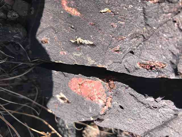 黑灰色的矿石间还长着粉红色的斑点或瘤子,它们都零星散落在矿石的表面,十分地添彩。其颜色也是或浅或深,浅一点的就是淡粉色,深一点的可以达到柿子红的级别,最大不过矿泉水瓶盖的大小。