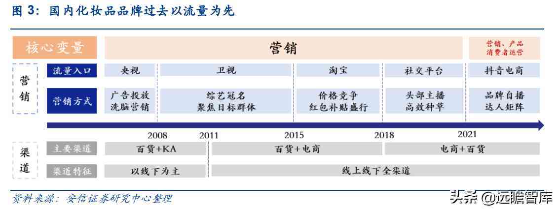 复盘国内化妆品行业的发展历程,我们发现品牌出圈的关键在于抓住渠道/流量红利。2000 年起,随着流量入口从央视—卫视—淘宝—社交平台—抖音电商的依次切换,在此其中把握住各阶段流量风口变迁的化妆品往往能迅速占领市场。