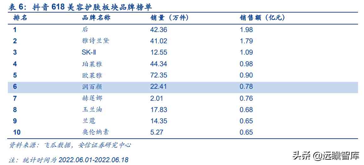 随着拼多多/京东等平台积极拓展电商业务,同时抖音/小红书/快手等社交平台逐渐电商化,淘系平台的流量被动分流。从今年 618 数据中可以验证:根据星图数据,化妆品整体销售表现承压,护肤、彩妆板块全网销售额分别-18.9%、-22.1%,但其在部分平台表现超出预期,以拼多多为例,拼单量同比+122%;同时根据飞瓜数据,618抖音平台美妆类目销售额同比增加126%。