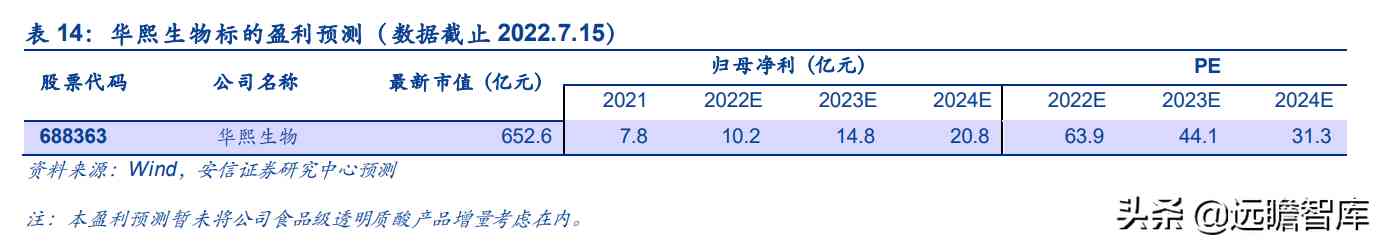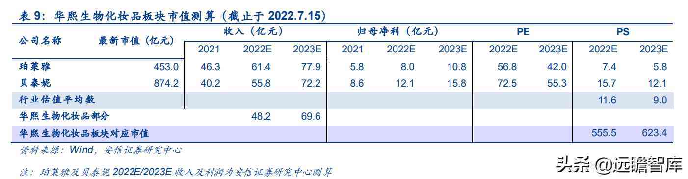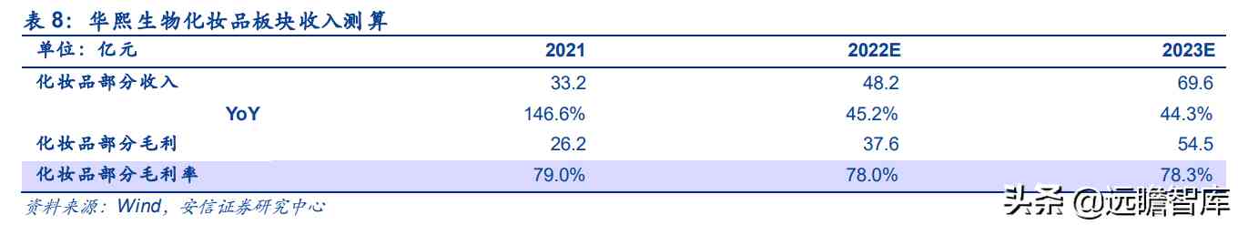鉴于华熙生物在玻尿酸原料市场的龙头地位,选取全球化学防晒剂龙头科思股份头为可比公司。参考可比上市公司估值情况,给予2022年33.7xPE,原料板块业务对应市值为148.0亿元。