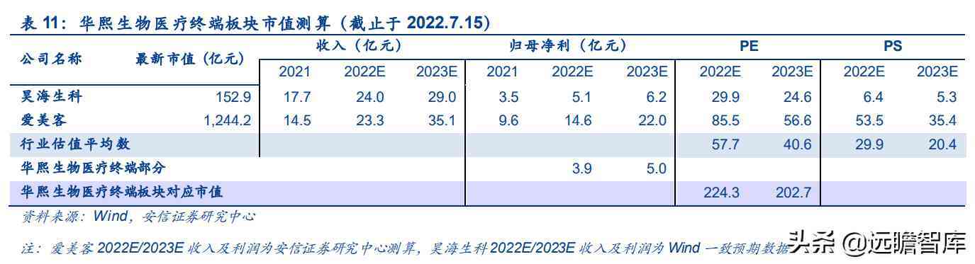 考虑华熙生物医疗终端板块业务包括医美及眼科、骨科等医疗用品,选取 A 股昊海生科及爱美客为可比公司,参考可比上市公司估值情况,给予2022年57.7xPE,医疗终端板块业务对应市值为224.3亿元。