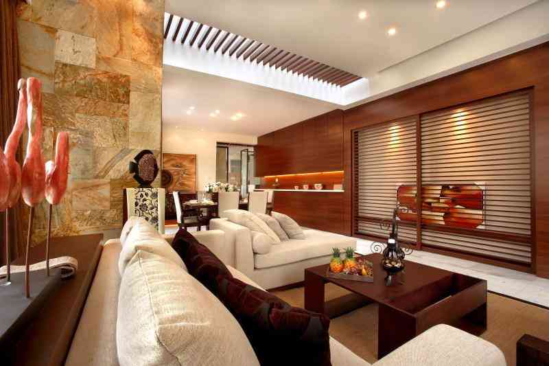 客厅是家居中最主要的公共活动空间,不管是否做人工吊顶,都必须确保空间的高度,这个高度是指客厅应是家居中空间净高最大者(楼梯间除外)。这种最高化包括使用各种视错觉处理。